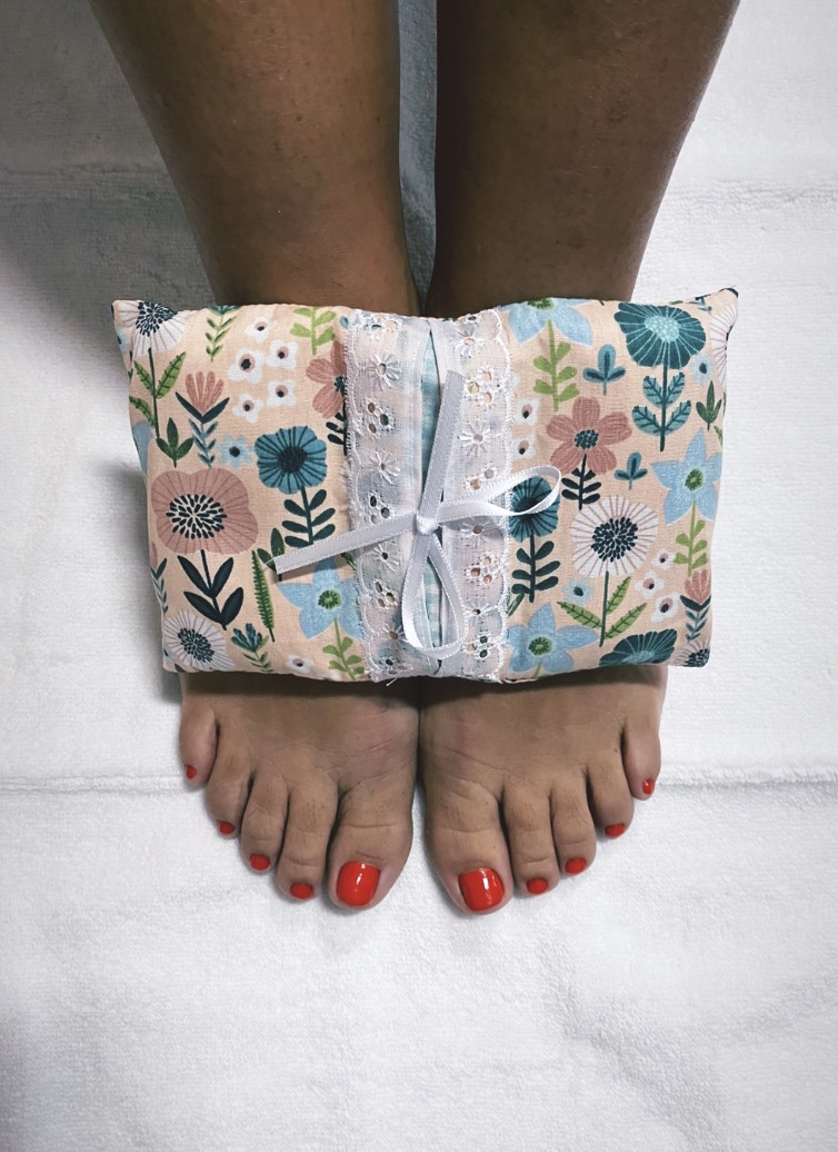 Ao esquentar ela no microondas por 1min30s a 2min30s - de acordo com a potência do aparelho e a temperatura desejada - e colocá-la no local desejado, o calor dilata os vasos e aumenta o fluxo de sangue, aliviando as tensões, dores e inquietações. A almofada retém o calor aproximadamente de 15 a 30 min, e pode ser reaquecida.