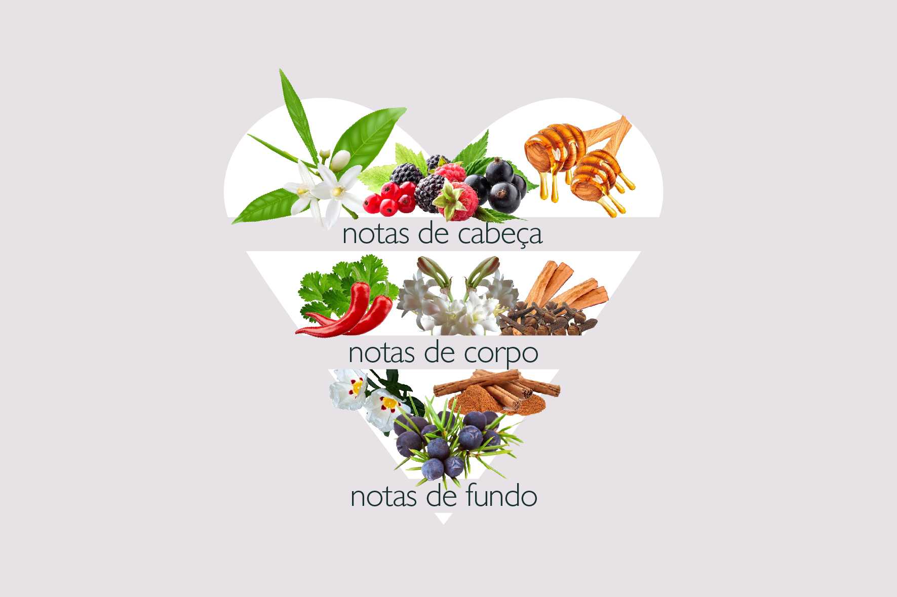 “Notas”, outro conceito que precisa ser explorado para conseguirmos entender melhor a pirâmide. As notas são basicamente os ingredientes da fragrância e estão inseridas dentro de cada família olfativa, como por exemplo, a baunilha na família oriental. Elas são classificadas em três: notas de cabeça, notas de corpo e notas de fundo.