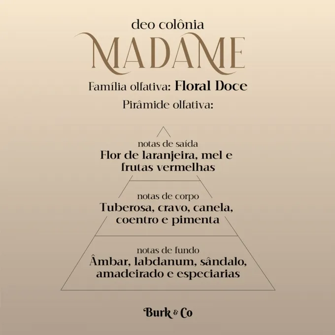 Elegante e clássico, mas com combinações aromáticas exóticas! Desenvolvido - por Julio Burko em conjunto com um famoso perfumista francês - e lançado em 1987, o antigo “Madame de Julie”, é agora, o “Madame” da Burk & Co. Com o poder de conquistar eternamente e tornar a presença de uma mulher inesquecível, o Madame sempre se destacou por ser um perfume provocante e misterioso.